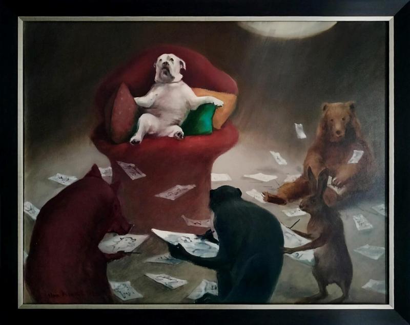 V tlmenom svetle sa zvieratá sústredene snažia zachytiť podobu psa, majestátne sediaceho na červenom kresle. Avšak ich štetce a perá nekompromisne odrážajú len to, čo poznajú najlepšie – samých seba. Prasa vidí v jeho líniách vlastný rypák, medveď zasa zaoblené tvary, ktoré mu pripomínajú jeho mohutnú postavu. Zajac jemne tvaruje dlhé uši a opica zachytáva zvedavosť vlastných očí.Pes sedí nepohnuto, s výrazom tichej nadradenosti – akoby vedel, že nech sa snažia akokoľvek, ich obrazy budú vždy len odrazom ich vlastných duší.