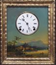 Švédsko, Westervik 1880 - 1910. Dřevo, ruční malba na zinkovém plechu, originální klíč součástí. Období a styl: romantismus. Výška 37,5 cm, šířka 32 cm a hloubka 12 cm. Ručně malované obrazové rámové hodiny v romantickém stylu. Stroj s kotvovým krokem, půlové bití na pružiny. Bílý emailový ciferník s ručně černě malovanými římskými číslicemi. Ocelové modřené hodinové ručičky. Dřevěná skříňka hodin s odklopnými dvířky, zlatým rámem a sklem. Čelní strana dekorovaná ručně malovanou krajinou s plachetnicí, rybářem na loďce a domky s malým kostelíkem pod horskými velikány. Uvnitř hodin originální papírový štítek: Adolf M. Norstedt, Uhrhandel, Optiska Magasin, Westervik. Originální klíč přiložen. Funkční.