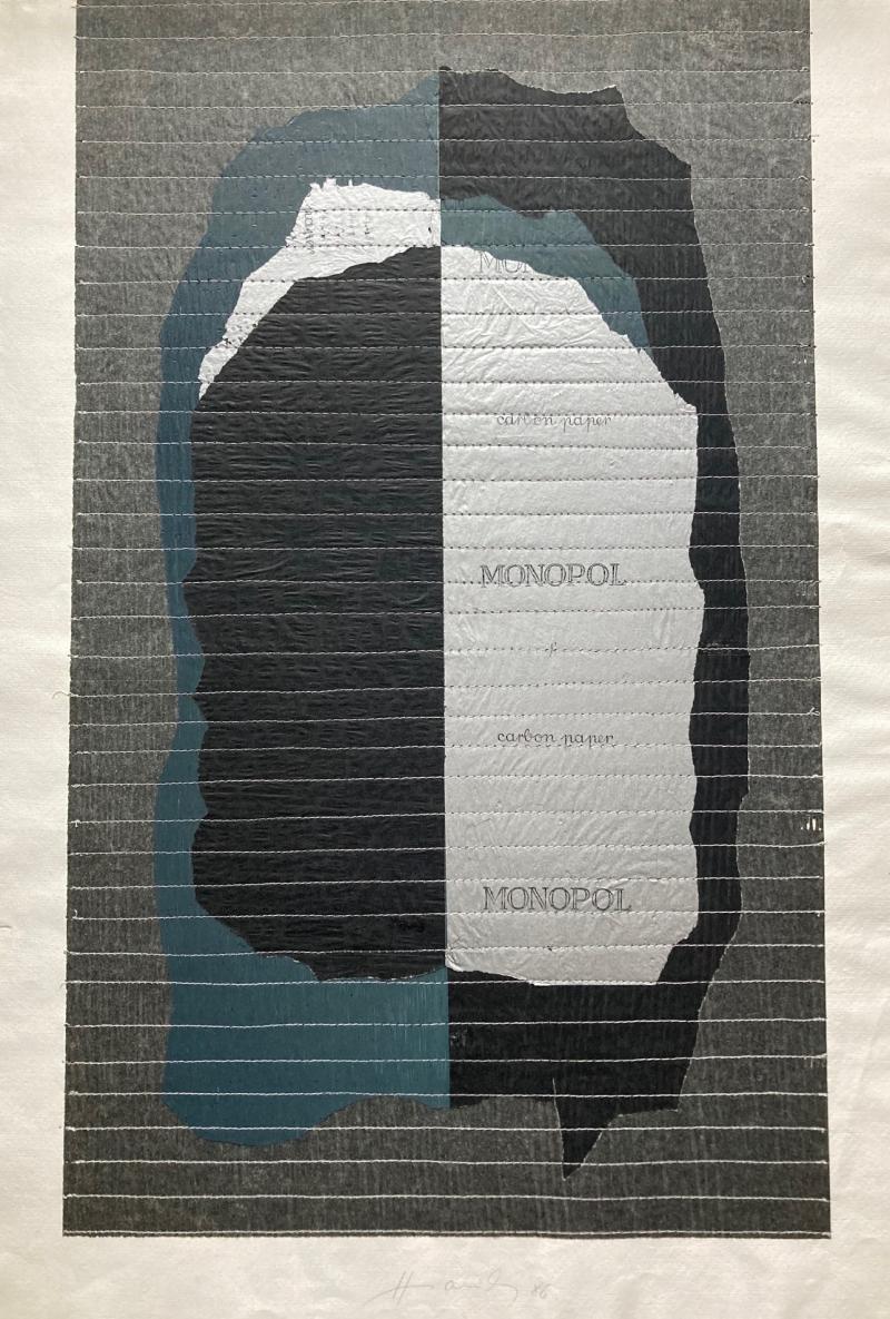 Josef Hampl - Carbon paper IV 1986, šitá koláž/kombinovaná technika, ručný papier, 59 x 42 cm, ručne signované, nerámované. Josef Hampl (1932 - 2019) Bol známy ako autor koláží, maliar, sochár, grafik a patril medzi zakladateľov českého abstraktného umenia. Preslávil sa svojou originálnou technikou šitej koláže. Venoval sa aj sochárstvu a realizácii projektov land artu. Spolupracoval s množstvom významných osobností, ako napríklad Vladimír Boudník, Bohumil Hrabal a Jiří Kolář. Samostatne vystavoval od roku 1964 a počas 70. a 80. rokov bol známy aj v zahraničí. V roku 2017 mu bola udelená Cena Vladimíra Boudníka za významný prínos českej grafike.