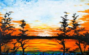 V tomto diele som do každého ťahu štetcom vložil svoju vášeň pre žiarivé západy slnka a zachytil ohnivú oblohu, ktorá sa topi v pokojných vodách. Pomocou impresionizmu s akrylovými farbami som chcel evokovať teplo a pokoj prírody, ktorá sa lúči s dňom. Tento obraz prinesie živú, no zároveň pokojnú energiu do každého priestoru a vyzve na chvíle zamyslenia a úžasu nad krásou prírody. Akryl na plátne. Maľované aj cez 2cm okraje plátna.